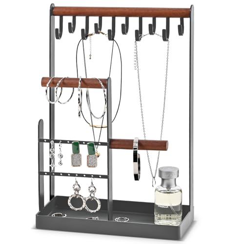 ProCase Jewellery Organiser Jewellery Stand Holder, 4 Tiers Jewelry Stands Necklace Organizer Earring Holder, 10 Hooks Jewelry Tower Display for Bracelets Watches Rings Gifts for Women -Grey