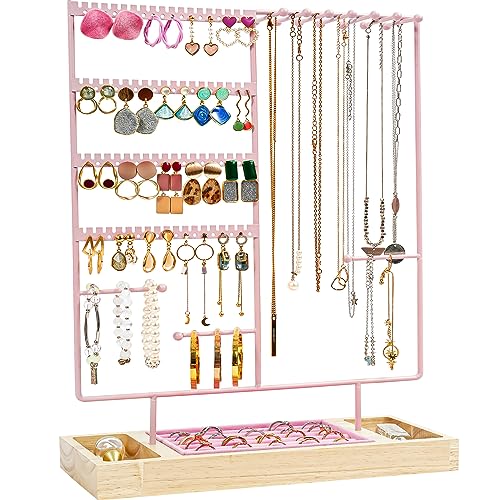 ProCase Jewellery Organiser Stand Earring Holder, 144 Holes Stud Earring Display Rack Necklace Storage Tower with Removable Wood Ring Tray for Necklaces Earrings Bracelets Rings -Pink
