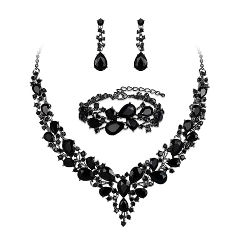 Ever Faith Wedding Bridal Jewellery Sets for Women, Sparkly Rhinestone Crystal Floral Teardrop Cluster Statement Necklace Dangle Drop Earrings Bracelet Set 3 Pcs Costume Jewelry Black Black-Tone