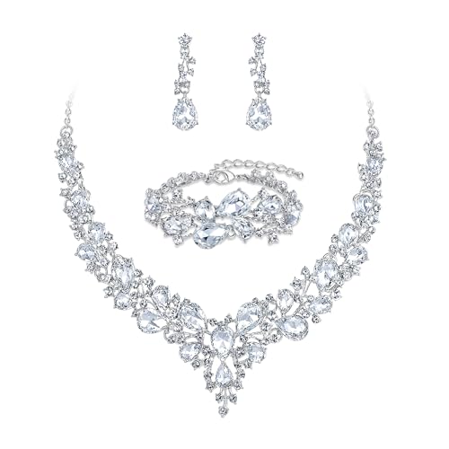 Ever Faith Wedding Bridal Jewellery Sets for Women, Sparkly Rhinestone Crystal Floral Teardrop Cluster Statement Necklace Dangle Drop Earrings Bracelet Set 3 Pcs Costume Jewelry White Silver-Tone