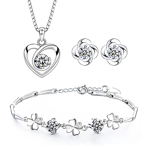 Josfeva Silver Jewellery Sets for Women, 925 Sterling Silver Heart Pendant Necklace & Clover Stud Earrings & Bracelet Set with Cubic Zirconia, Bridal Wedding Bridesmaid Ladies Jewellery Gift Set