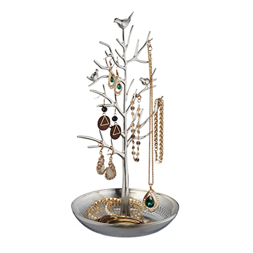 Relaxdays Jewellery Tree, Stand with Tray, H x W x D: Approx. 30 x 16 x 15 cm, Metal, Silver