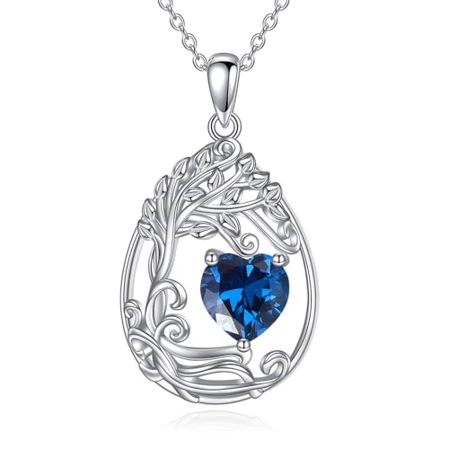 Tree of Life Birthstone Necklace for Women Sterling Silver Tree Jewellery Sapphire September Pendant Blue Gemstone Anniversary Birthday Christmas Gifts for Wife Mom Her (09-Sep-Sapphire)