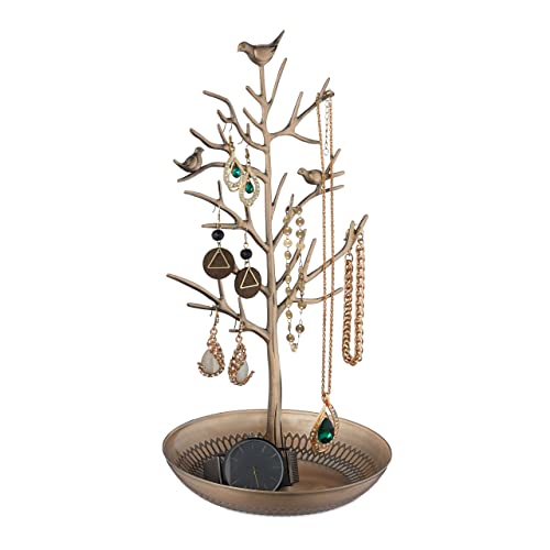 Relaxdays Jewellery Tree, Stand with Tray, H x W x D: Approx. 30 x 16 x 15 cm, Metal, Gold