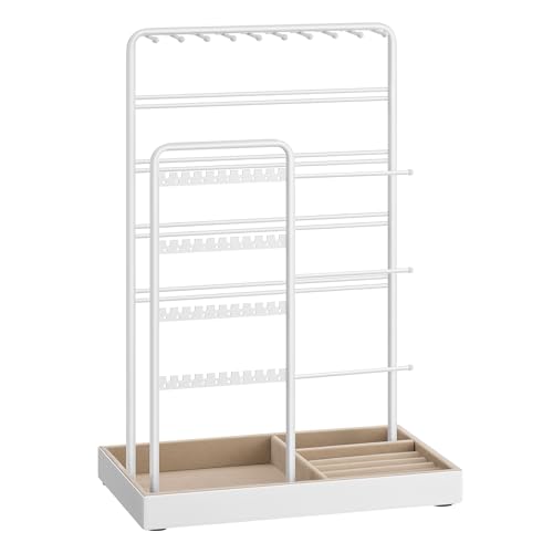 SONGMICS Jewellery Stand, Jewellery Organiser, Jewellery Display Stand, Metal Frame, Velvet Tray, Earring Bracelet Necklace Holder, for Studs, Rings, Gift Idea, Matte White JJS028W01