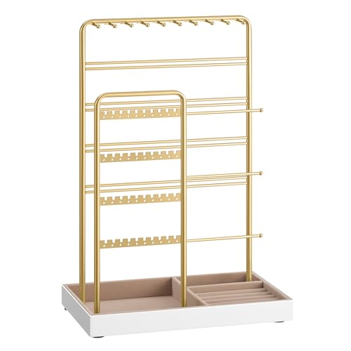 SONGMICS Jewellery Stand, Jewellery Organiser, Jewellery Display Stand with Metal Frame and Velvet Tray, Earring Bracelet Holder, Necklace Stand, for Studs, Rings, Gift Idea, Gold Colour JJS021A01