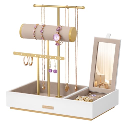 SONGMICS Jewellery Stand, Metal Jewellery Earring Organiser, Jewellery Display Stand with Mirror, with Earring Bracelet Holder, Necklace Stand, for Rings, Gift Idea, White and Gold JJS022W01