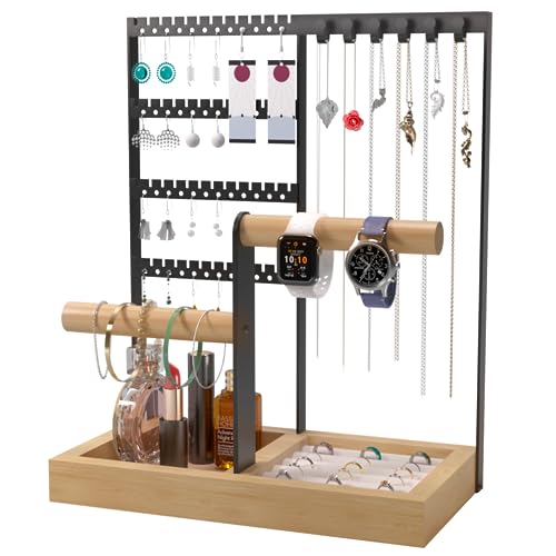 Benxdara Jewellery Stand Organiser, 4-Tier Necklace Holder Stand Display with Necklace Organizer, Wooden Ring Organizer Earring Tray for Bracelets Watches Earrings Rings, Black