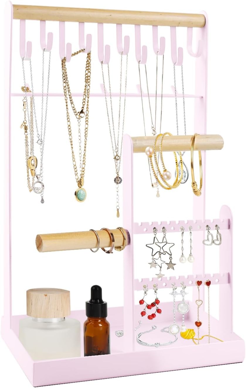 4-Tier Jewellery Organiser Stand – Earring Necklace Holder with Wooden Tray