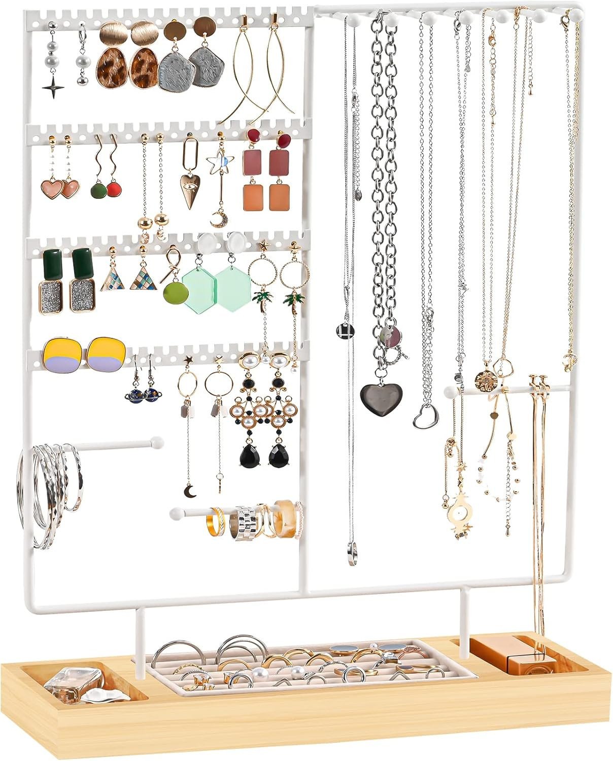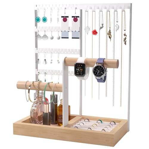 Benxdara Jewellery Stand Organiser, 4-Tier Necklace Holder Stand Display with Necklace Organizer, Wooden Ring Organizer Earring Tray for Bracelets Watches Earrings Rings, White