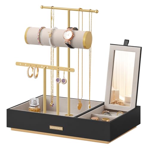 SONGMICS Jewellery Stand, Metal Jewellery Earring Organiser, Jewellery Display Stand with Mirror, with Earring Bracelet Holder, Necklace Stand, for Rings, Gift Idea, Black and Gold JJS022B01