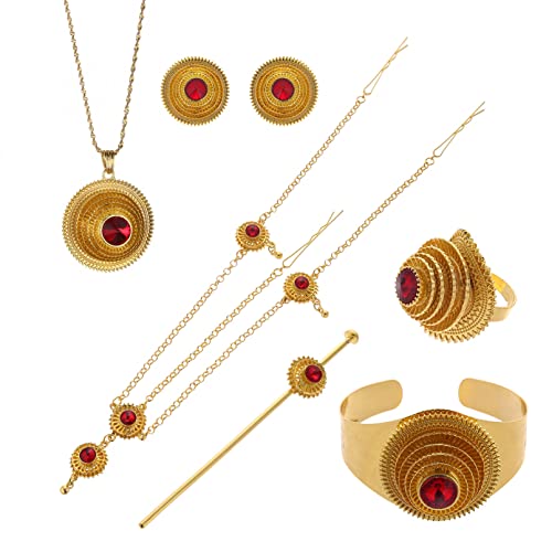 Aveanit Men's and Women's Accessories 6pcs/lot Ethiopian Ethnic Fashion Flower Red Zircon African Jewelry Set Africa Bridal Jewelry Sets For Women Father's Day Mother's Day Christmas Birthday Gift