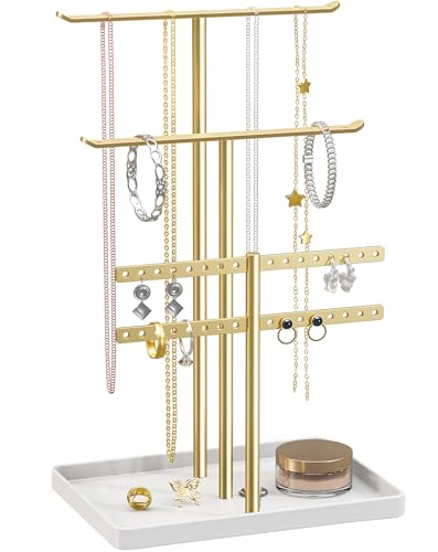 Jewelry Stand Organizer, 32cm Tall Sturdy Metal, 3-Tier Jewelry Holder for Necklace, Earring, Bracelet, Ring, Hanger for Display and Storage, Aesthetic Room Decor, Gold Jewlery Stand with White Tray