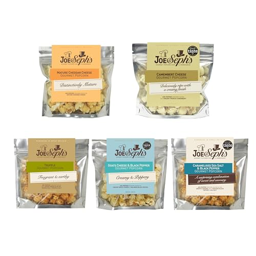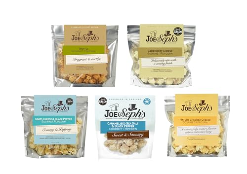 Joe & Seph's Savoury Popcorn Tasting Selection (5x30g) | Goats Cheese & Black Pepper, Cheddar Cheese, Truffle, Cheddar Cheese & Chilli and Camembert Cheese, gourmet popcorn, air-popped popcorn
