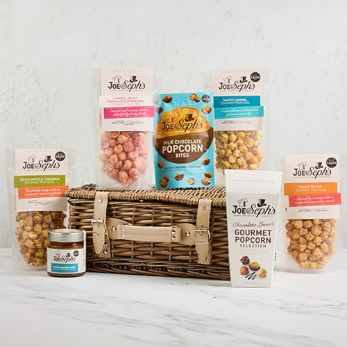 Joe & Sephs Gourmet Popcorn Hamper Gift, Best Selection with Salted Caramel Sauce, Chocolate Bites, Luxury Wicker Basket and Gift Card, Perfect for Popcorn Lovers