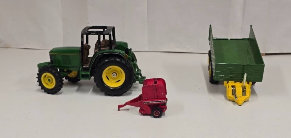 Siku John Deere Tractor, Front Loader & A Three-axle Tipping Trailer Toy Vehicles.
