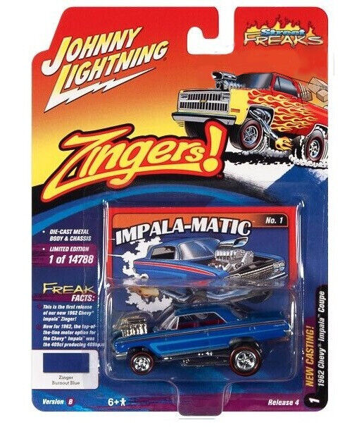 JOHNNY LIGHTNING 1/64 1962 CHEVY IMPALA COUPE BURNOUT BLUE ZINGERS JLSF022