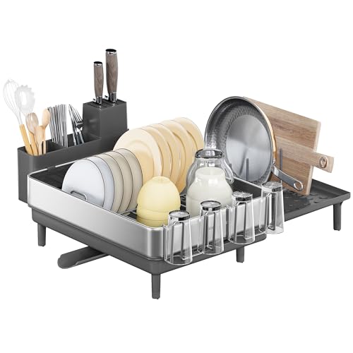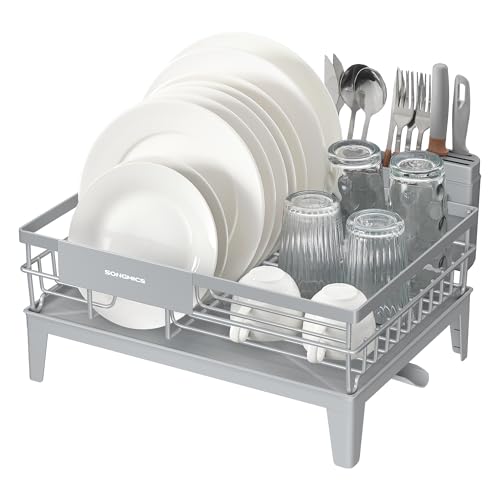 SONGMICS Dish Drainer Rack, Expandable Dish Drying Rack, Stainless Steel Kitchen Dish Rack with Rotatable Spout, Utensil, Cup, Glass, Cutting Board and Pan Holders, Silver and Grey KCS037G01
