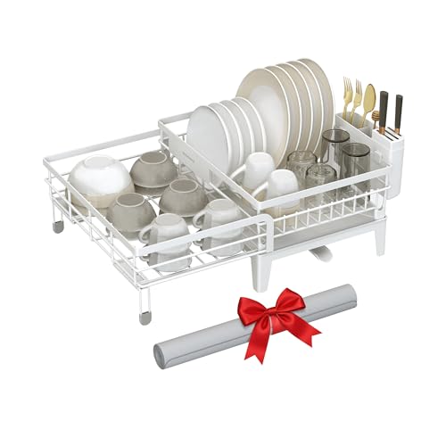 Kitsure Dish Drainer Rack - Extendable Dish Drainer, Multifunctional Dish Rack for Kitchen Counter, Anti-Rust Draining Board Rack with Cutlery & Cup Holders, 67.8cm x 32.7cm x 14.9cm, Grey