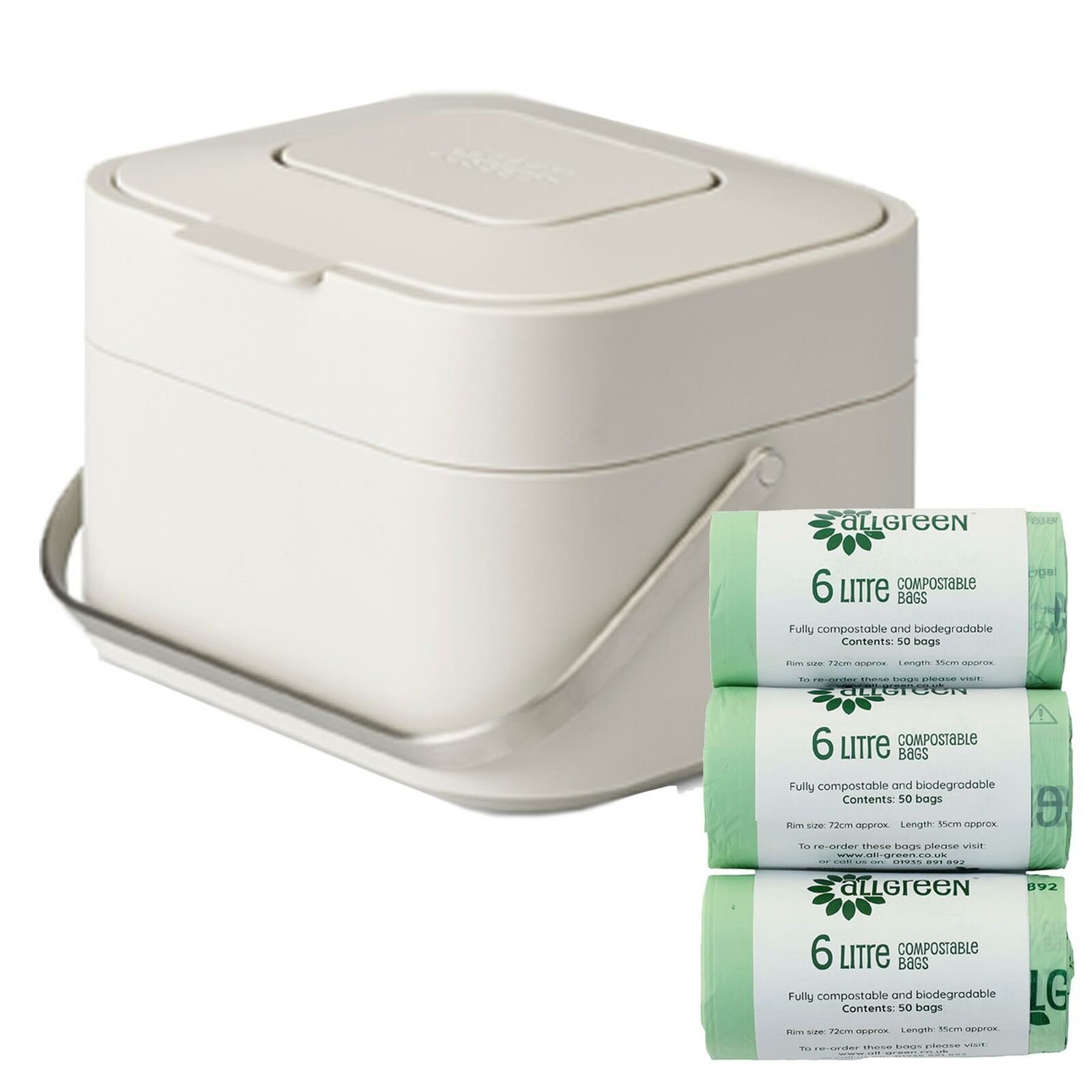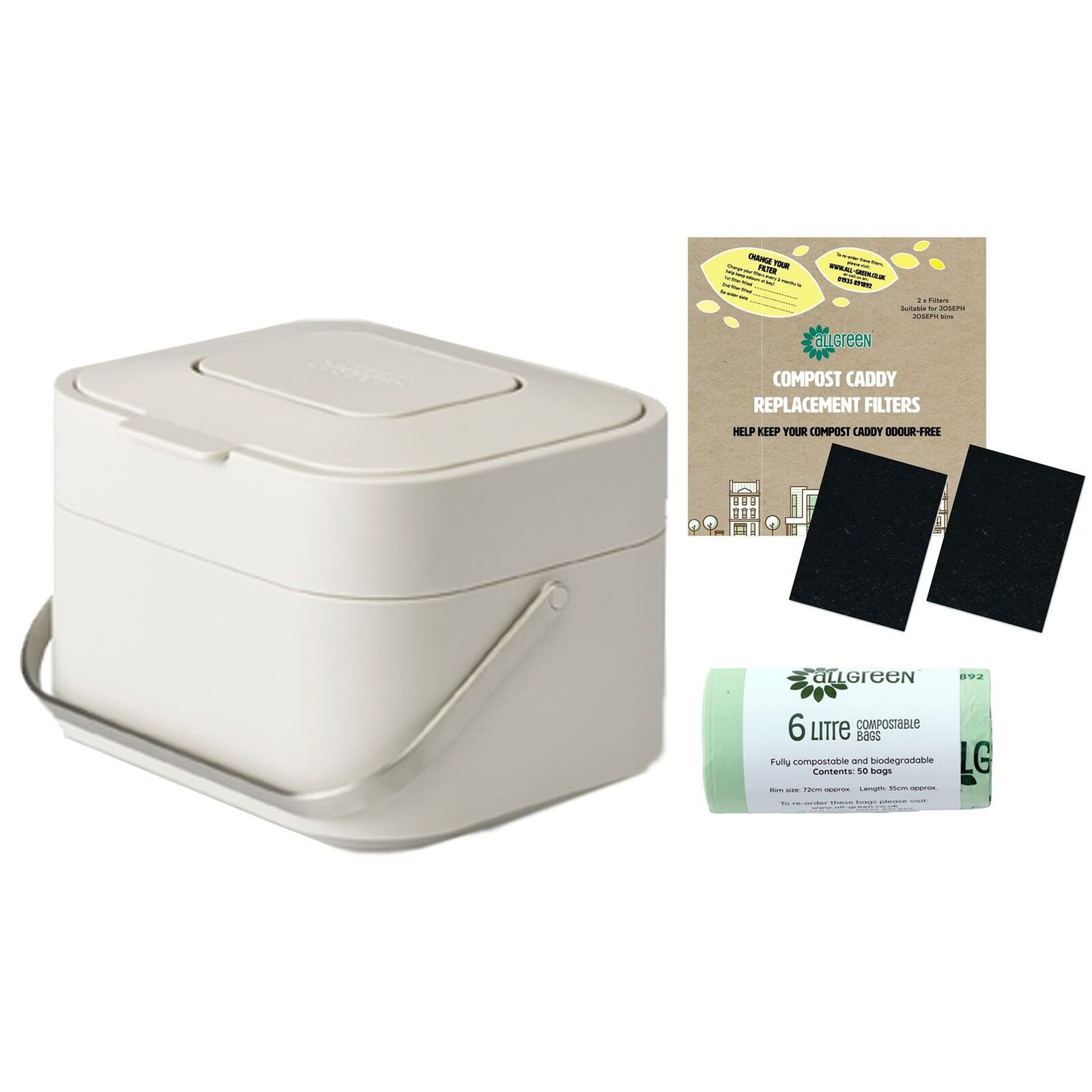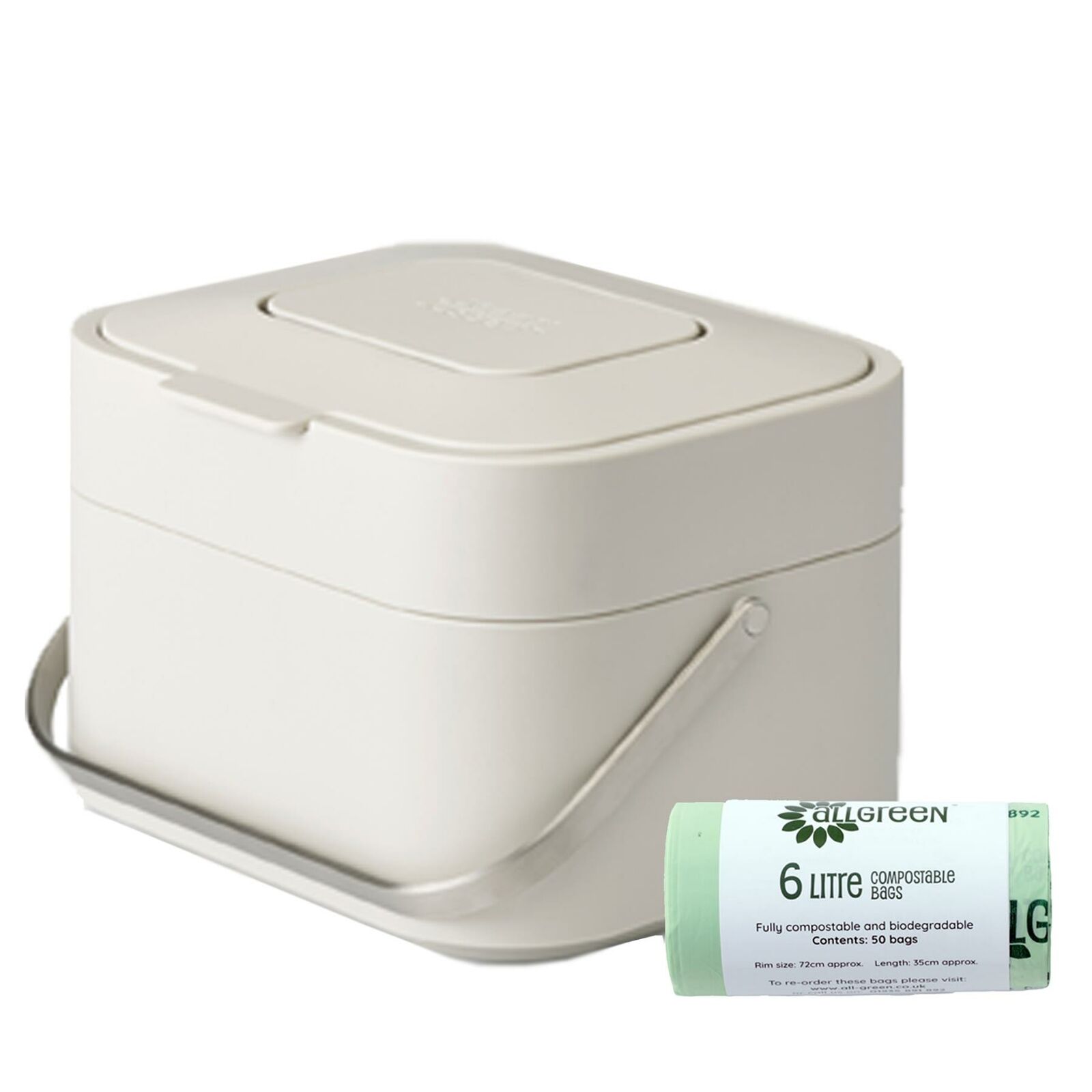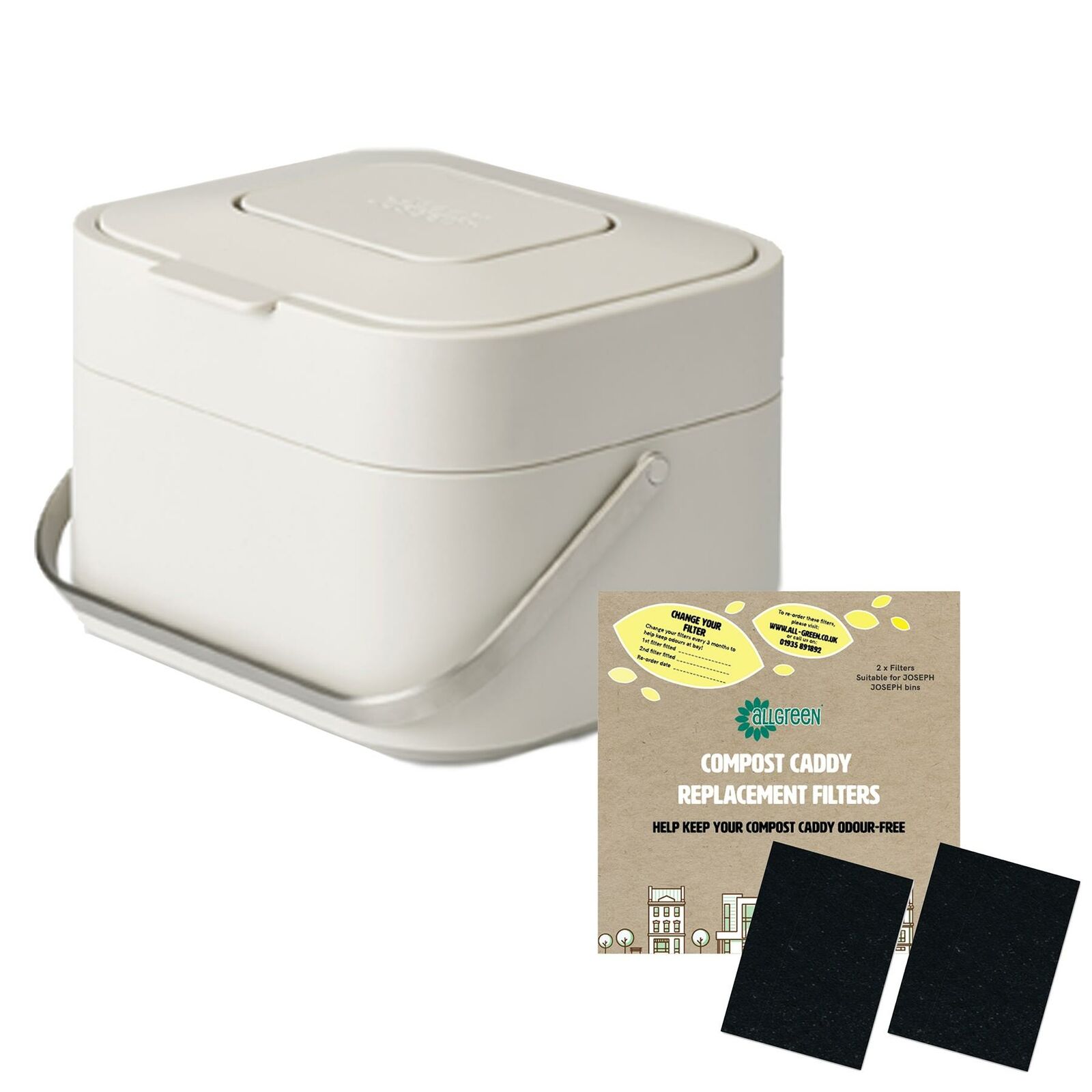 Joseph Joseph Stack 4 Food Waste Caddy–Stone–4 L & 50 x 6L Bags & 1 Filter Pack