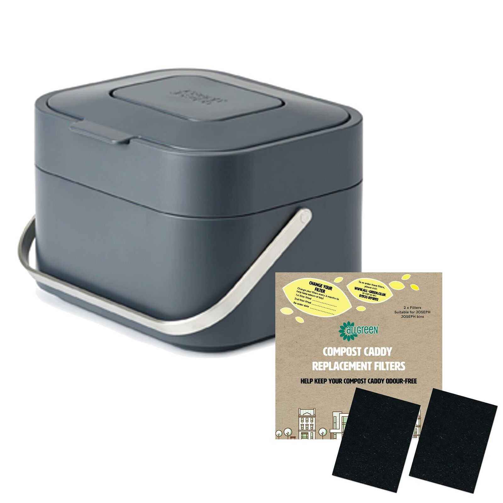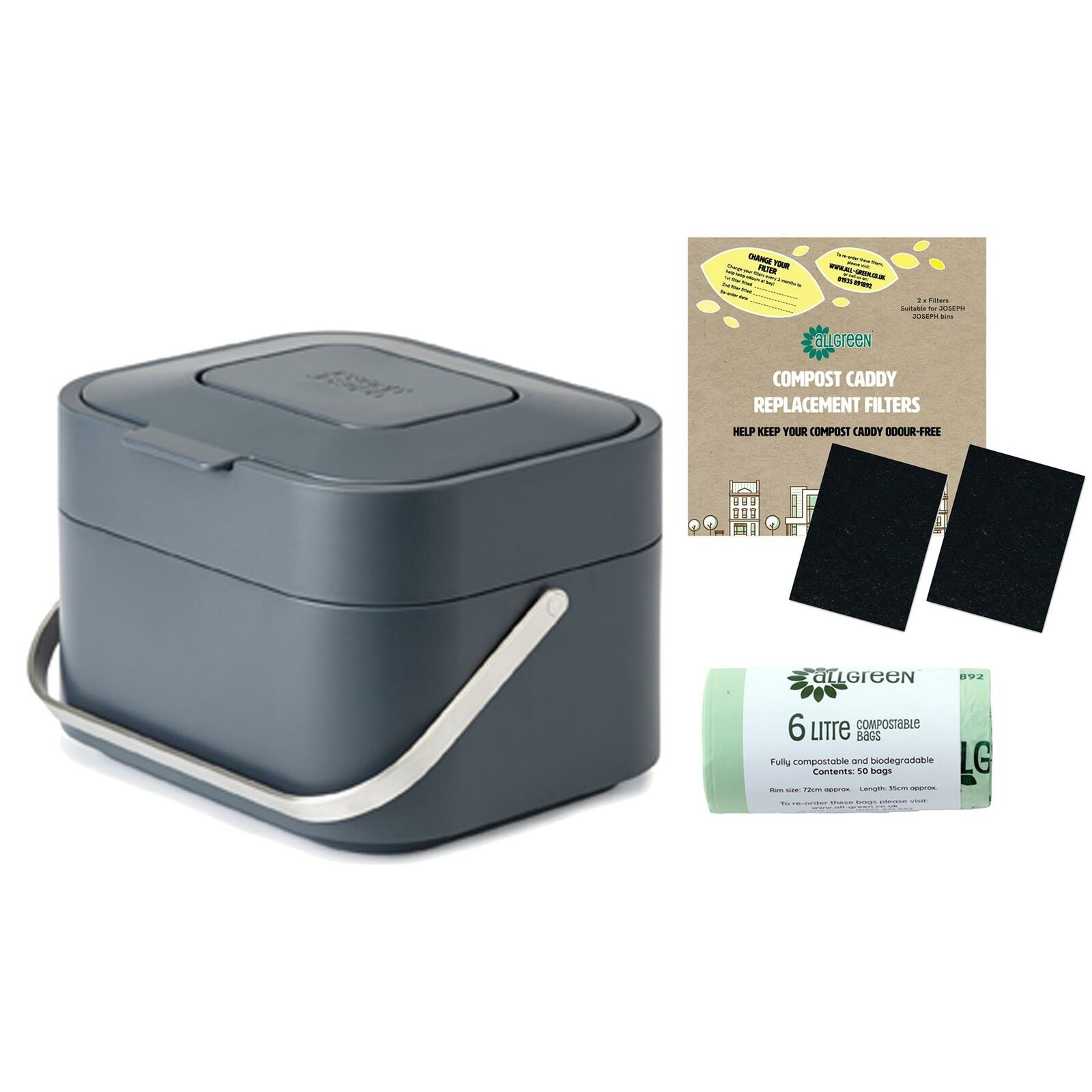 Joseph Joseph Stack 4 Food Waste Caddy–Graphite-4 L & 50 x 6L Bags & Filter Pack
