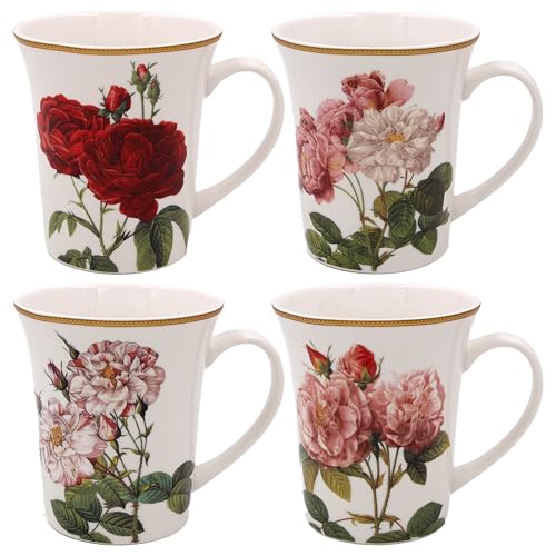 The Leonardo Collection Redoute Rose Mugs Set of 4 Pierre-Joseph Redoute, Tea and Coffee Mug for Hot Drinks | Fine China Printed Mugs for Kitchen & Home | Reusable Ceramic Cups for Every Occasion