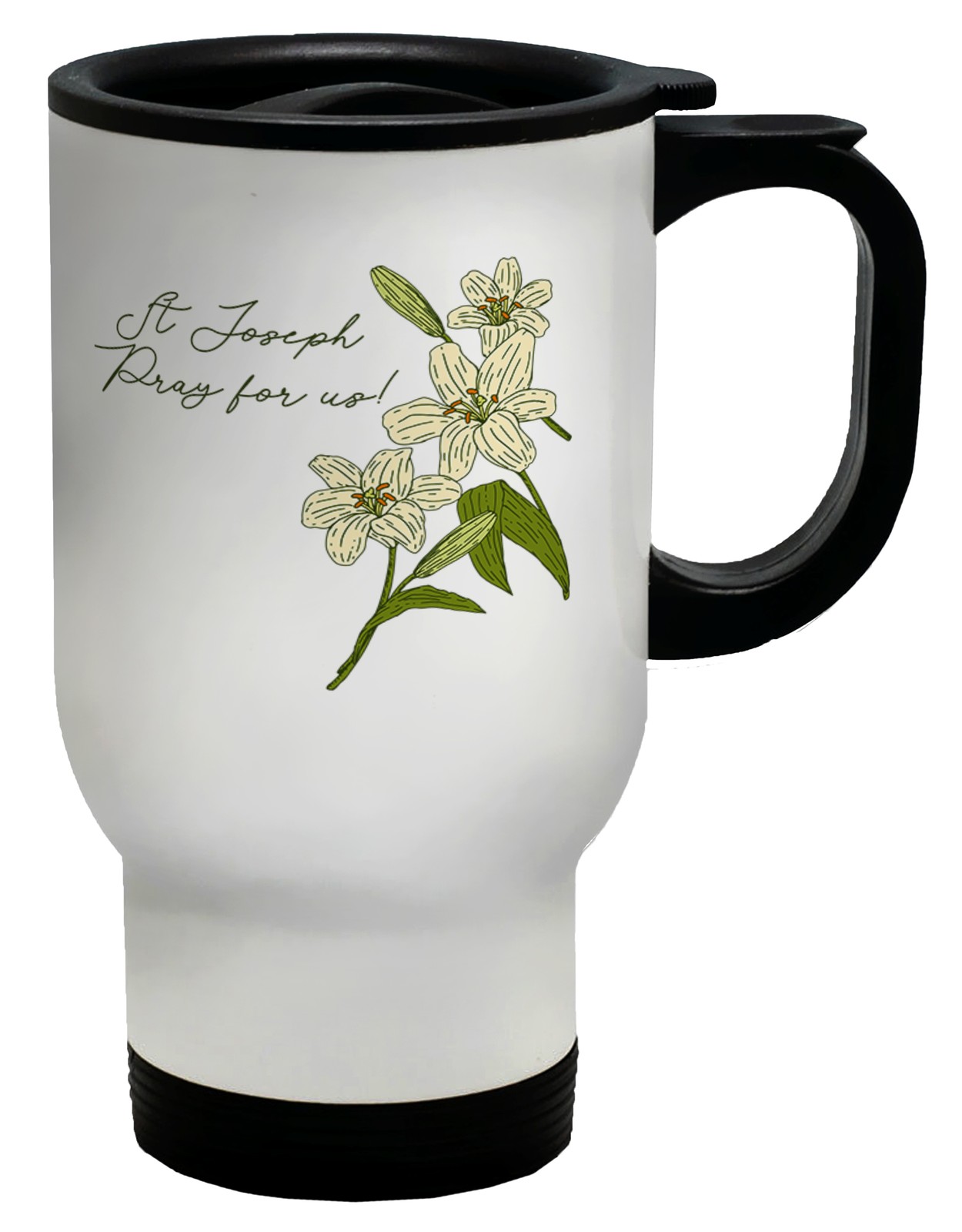 St Joseph Day Pray for Us Lillies Travel Mug Cup Gift White