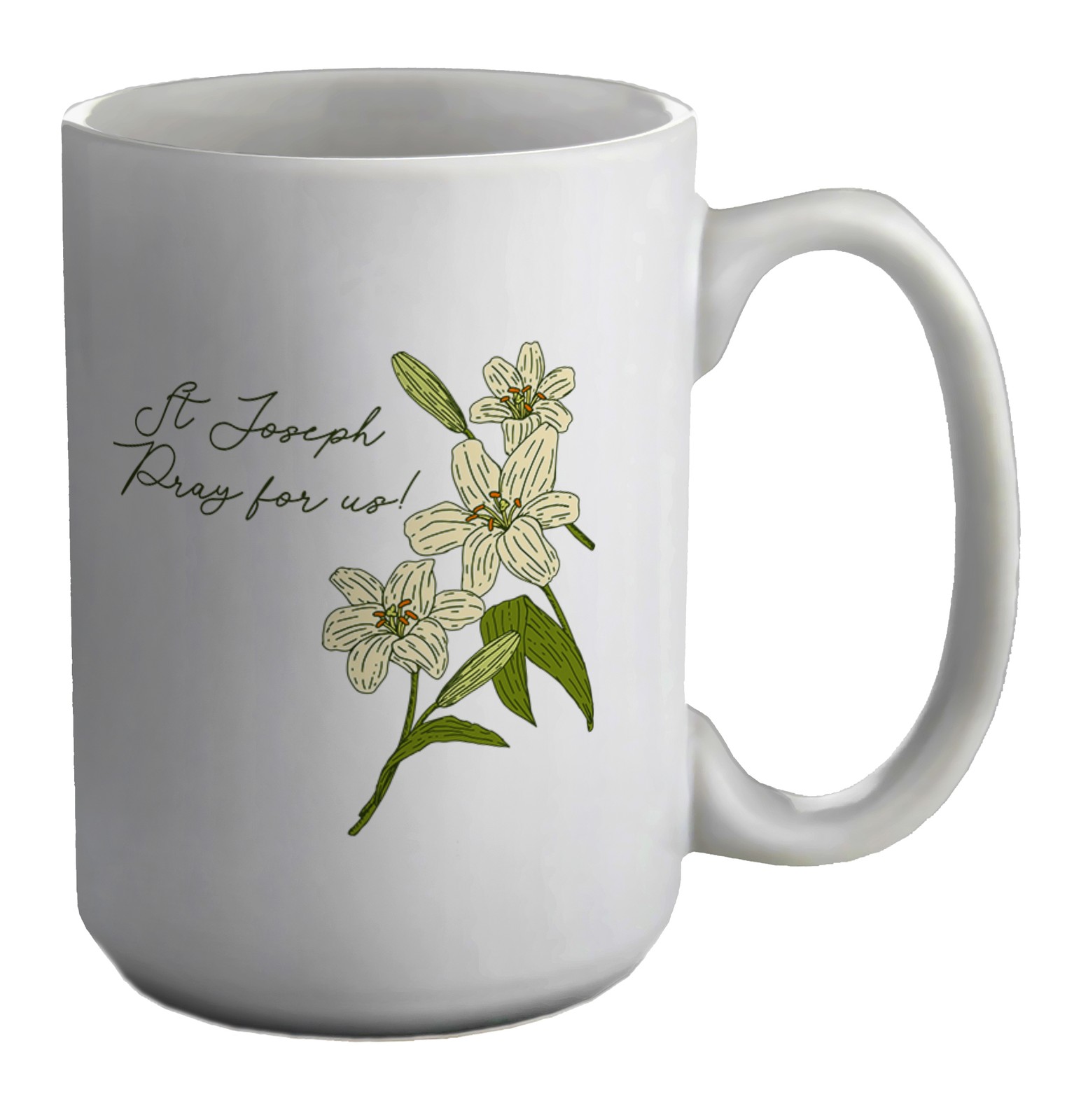 St Joseph Day Pray for Us Lillies Mug 15oz Large Cup Gift White