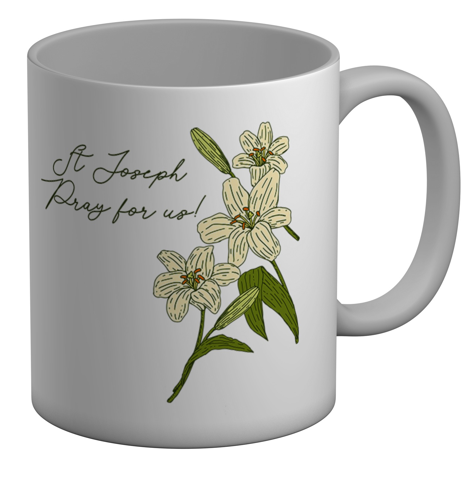St Joseph Day Pray for Us Lillies Mug 11oz Cup Gift White