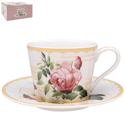 The Leonardo Collection Redoute Rose Cup & Saucer Pierre-Joseph Redoute for Hot & Cold Drinks | Durable Coffee Cups for Home & Office | Comfortable & Easy-to-Hold Coffee Mug