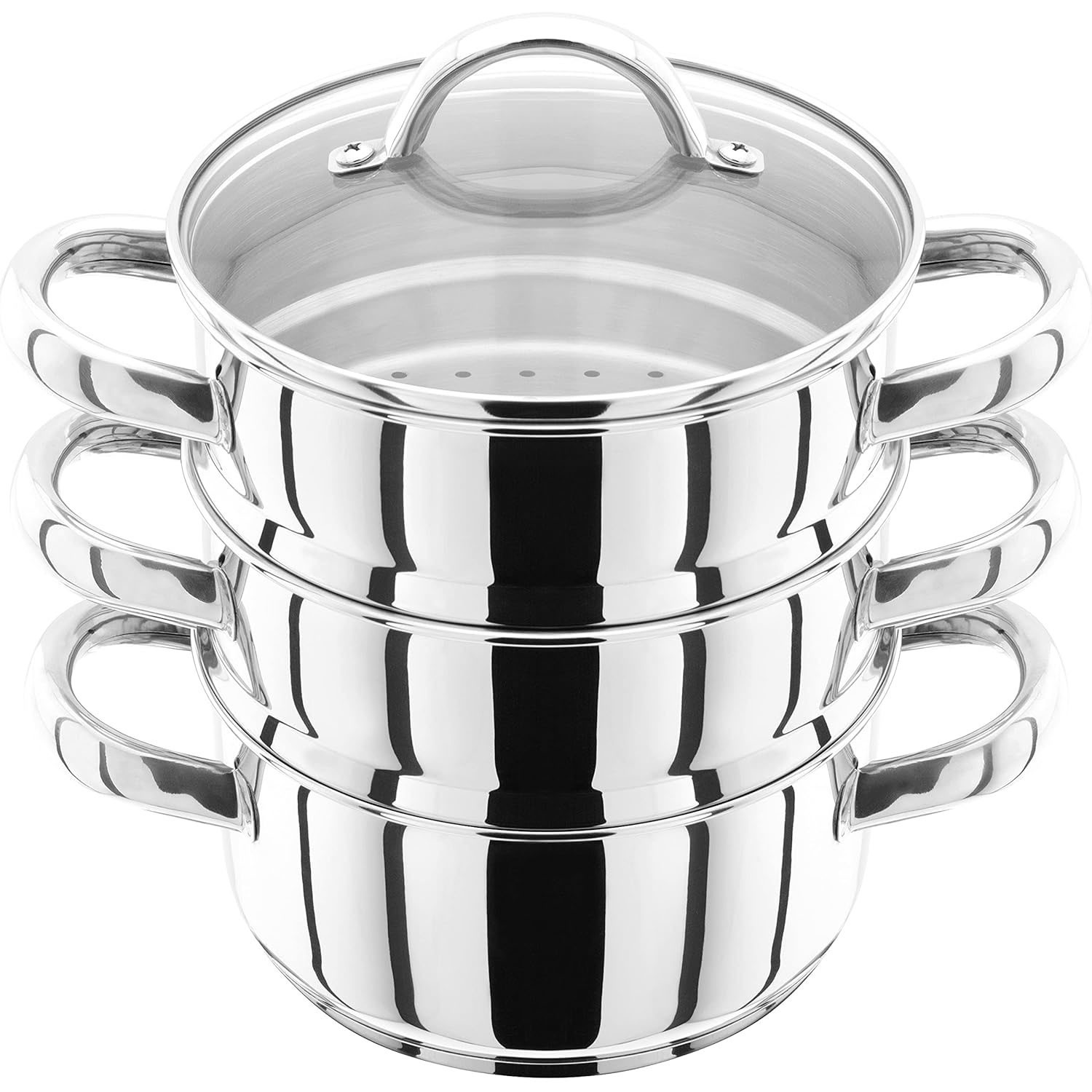 Essentials HX01 Stainless Steel 3 Tier Steamer 16cm, Vented Glass Lid, Integral Casserole Pot, Oven Safe, Induction Ready