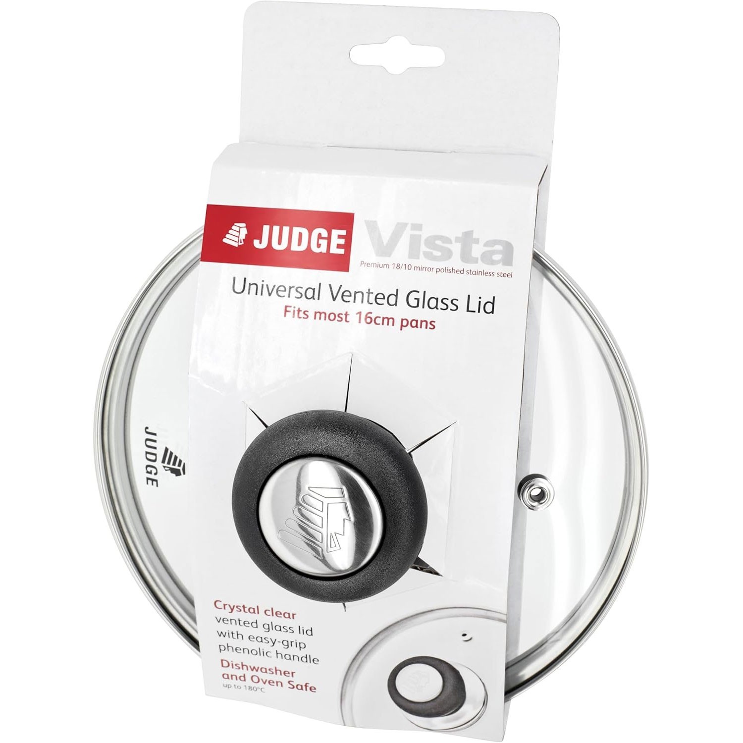 Judge Vista 16cm Replacement Glass Draining Lid ? Heat-Resistant Tempered Glass Lid with Built-In Strainer, Fits 14cm Saucepans & Pots, Dishwasher