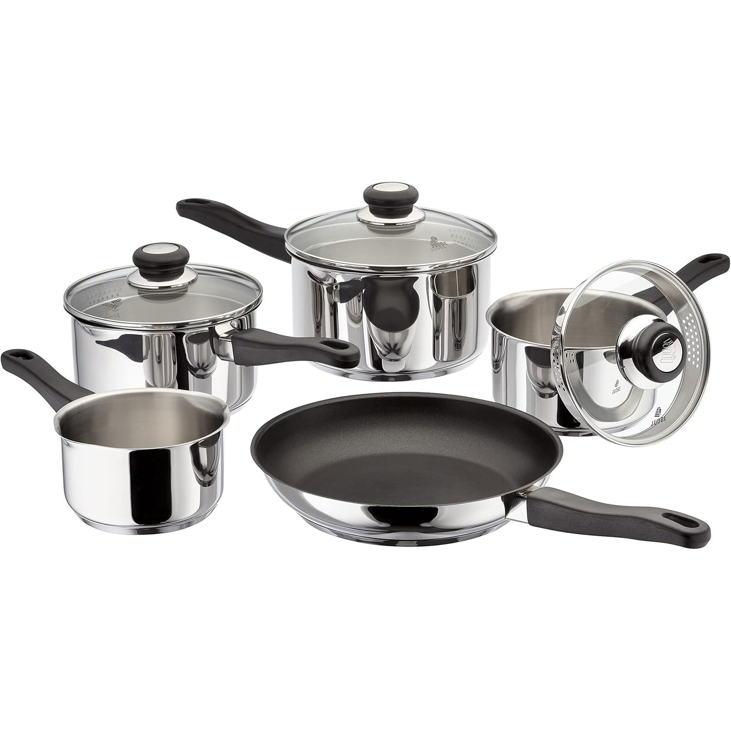 Judge Vista Draining Set of 5 Stainless Steel, 16cm 18cm 20cm Saucepans with Pouring Lip and Strainer Lids, 14cm Milk Pan, 26cm Non-Stick Frying Pan, Induction Ready, Oven Safe