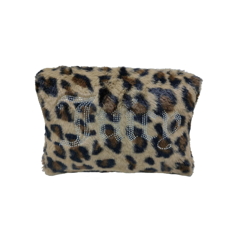 Juicy Couture Brown Makeup Bag Cosmetics Organizer Travel Essentials Zip Top Wedge Leopard Print Faux Fur Rhinestone