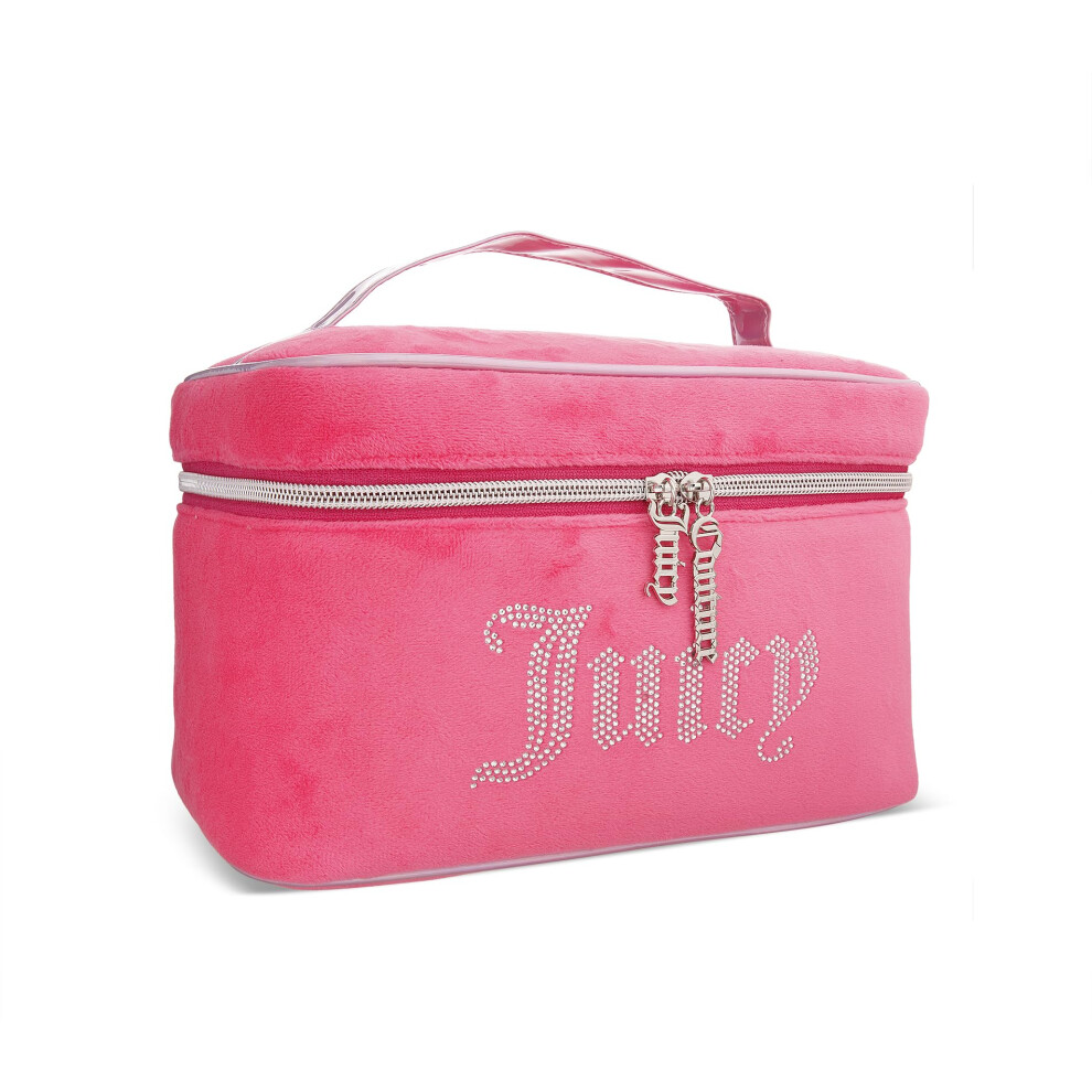 Juicy Couture Pink Silver Makeup Bag Cosmetics Organizer Travel Essentials Train Case Velour Rhinestones