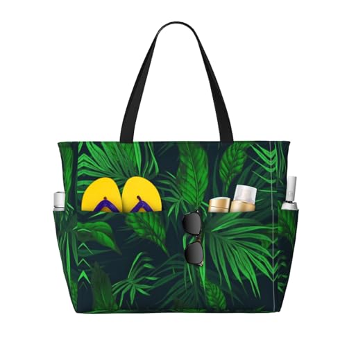 UFhgjjb Large Capacity Tote Bag – Green Tropical Jungle Plant Print Travel Beach Bag with Multiple Pockets for Vacation, Camping, Cruise