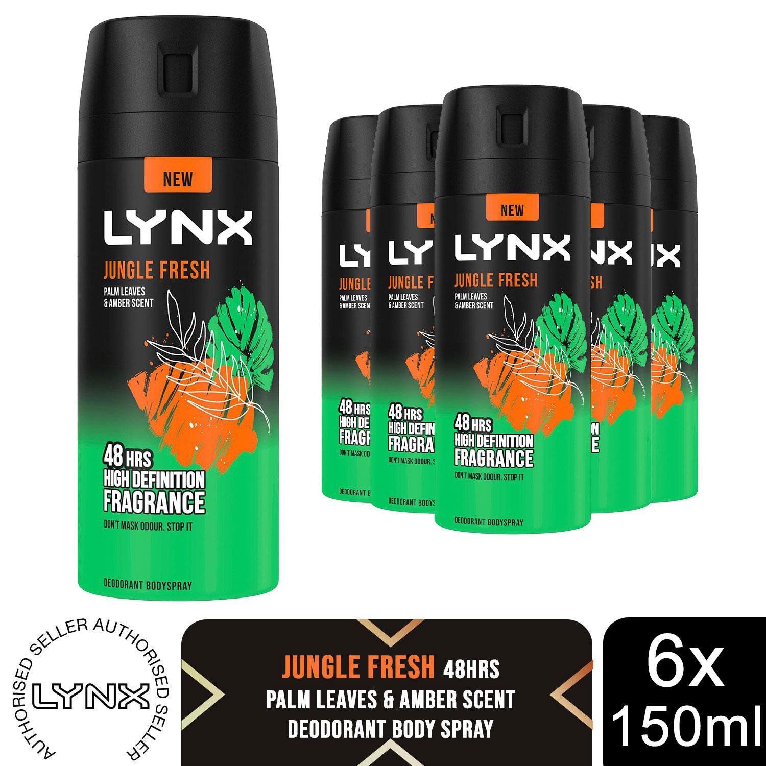 Lynx Men Jungle Fresh Deodorant Body Spray Antiperspirant for 72 hours protection against odour and wetness, with a palm leaves & amber scent 150 ml, Pack of 6