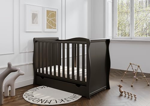 Viculii Willow Baby Sleigh Mini Cot Bed with Drawer Only | 120x60cm | 3 in 1 Baby Cot Converts to Toddler Bed Junior Bed (Black)