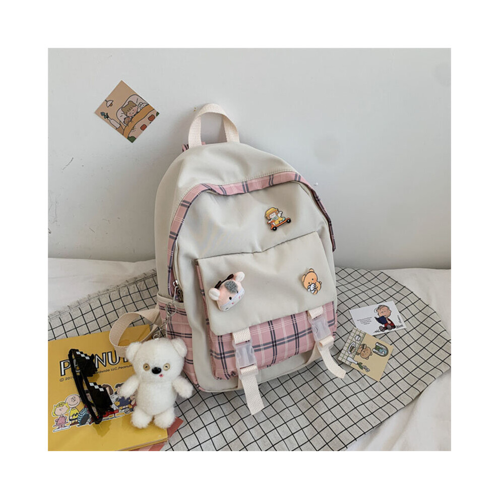 (1 Beige-with accessories) Japanese Female Large-Capacity Harajuku INS Campus Junior High School Matching Style Plaid Girl Backpack