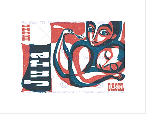 Wee Blue Coo TRAVEL BASEL HOTEL JURA RED BLUE WOODCUT NEW BLACK FRAMED ART PRINT B12X11301