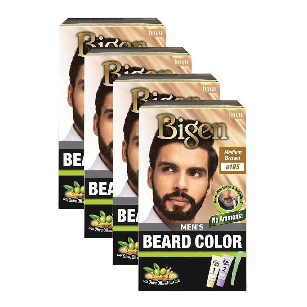 (Pack of 4) Bigen Men's Beard Colour B105 Medium Brown - No Ammonia Formula With Taurine & Olive Oil - Excellent Grey Hair Coverage