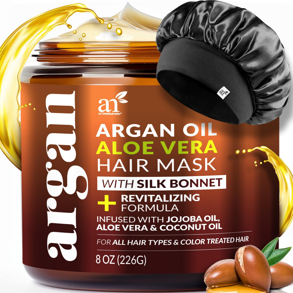 Hair Mask + Silk Bonnet for Sleeping Women Set - Deep Conditioner & Leave-In Conditioner for Dry Damaged Hair - Argan Oil Jojoba Aloe & Kerati