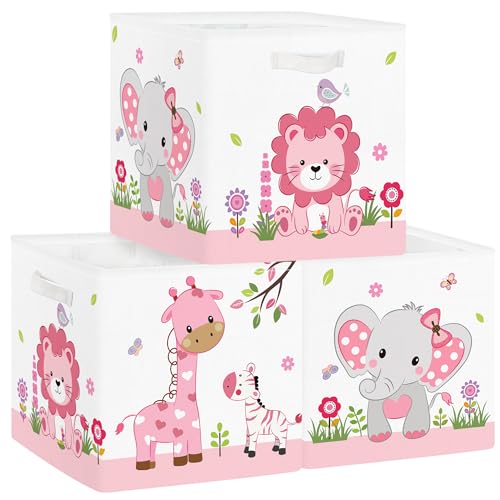 Clastyle 3 pcs Jungle Animal Cube Storage Unit Boxes Tree Kallax Box for Shelves Parents Storage Baskets for Book Clothes Toy Organizer,Pink,11.8x11.8x11.8 in