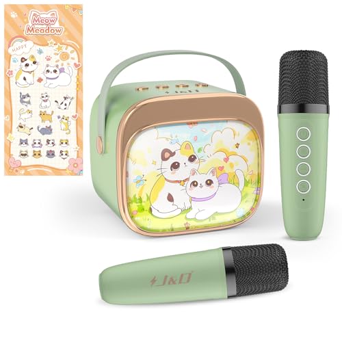 J&D Karaoke Machine 2 Microphones, Mini Karaoke Machine for Kids Teen Adults, Portable Bluetooth Speaker with Colorful LED and Cat Sticker for Girls Boys Age 3–10 Birthday Gifts, Princess Toys, Green