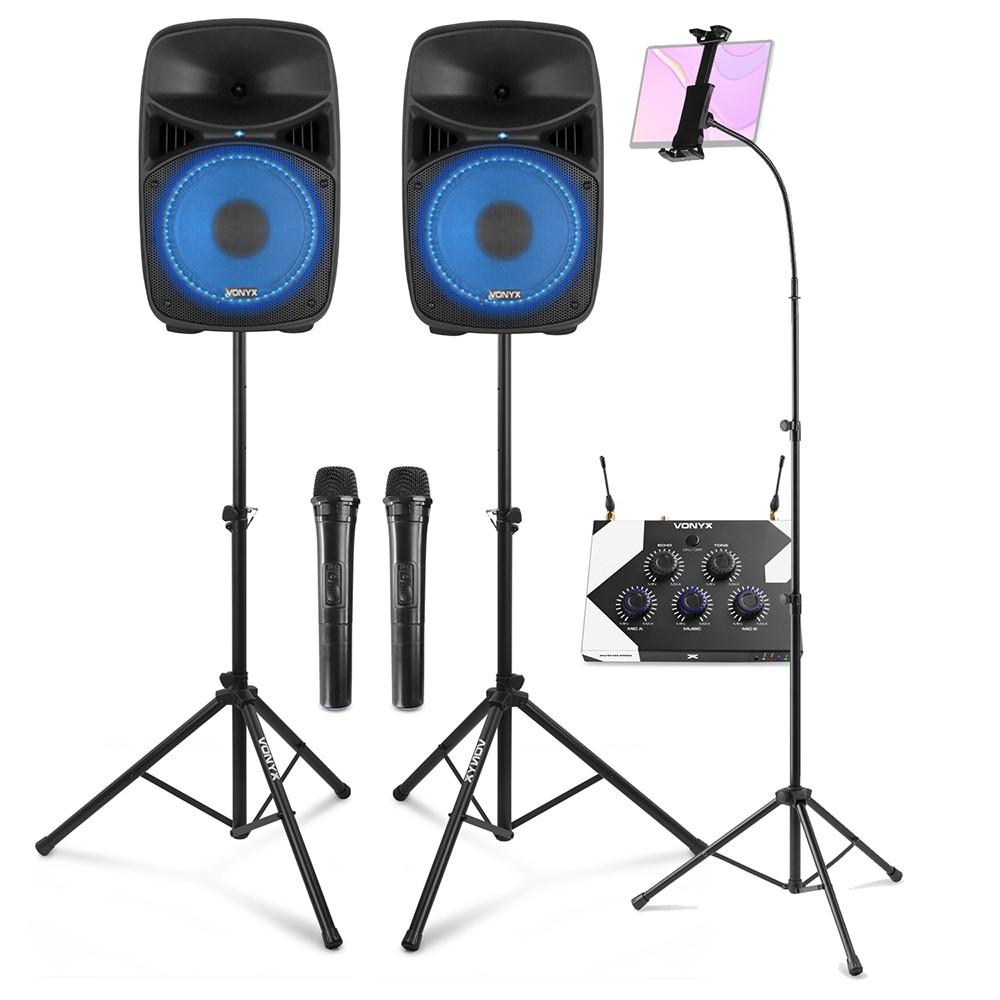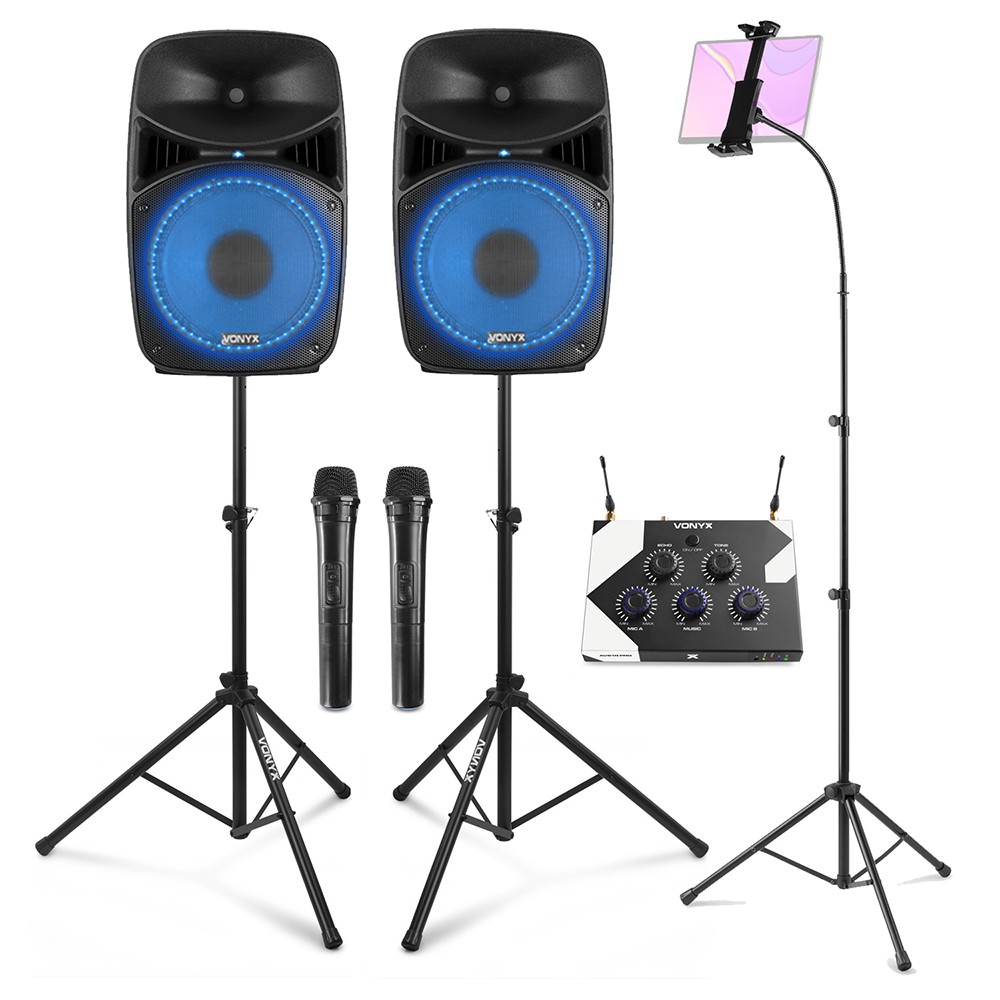 Home Karaoke Set with Tablet Mount, Wireless Mics, VPS102A PA Speakers & Stands