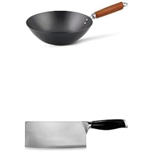 Bundle of Ken Hom Carbon Steel Non Stick Wok 27cm, Classic, Non-Induction/Wooden Handle/Flat Base Pan Black + Ken Hom Stainless Steel Cleaver Knife, 18 cm/7in