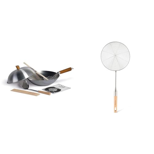 Ken Hom Carbon Steel Wok Set, 31cm, Classic & KH515 Stainless Steel Wire Mesh Ski mmer, Excellence, Wooden Handle/