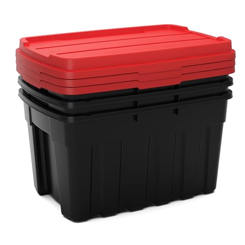 Keter Tuff Box 3x 68L Storage Boxes with Lid, Durable, Water Resistant, Large Capacity, Stackable, Black/Red