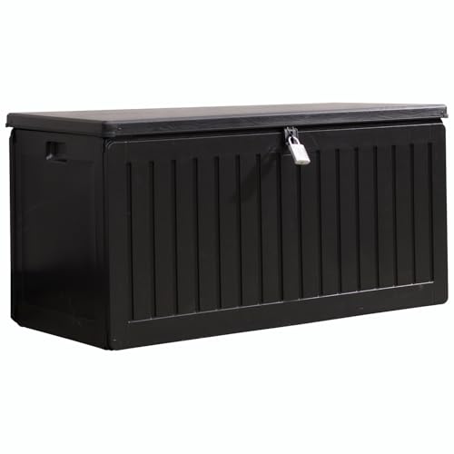 Olsen & Smith 270L Outdoor Storage Box with Padlock – Durable Sit-On Garden Chest, Weatherproof Plastic Shed Seat, Lockable Wood Effect Design for Patio, Deck, and Garage (Black)