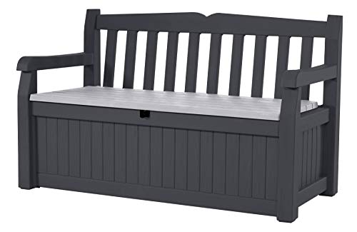 Keter Solana 70 Gallon Storage Bench Deck Box for Patio Furniture, Front Porch Decor and Outdoor Seating – Perfect to Store Garden Tools and Pool Floats, Graphite